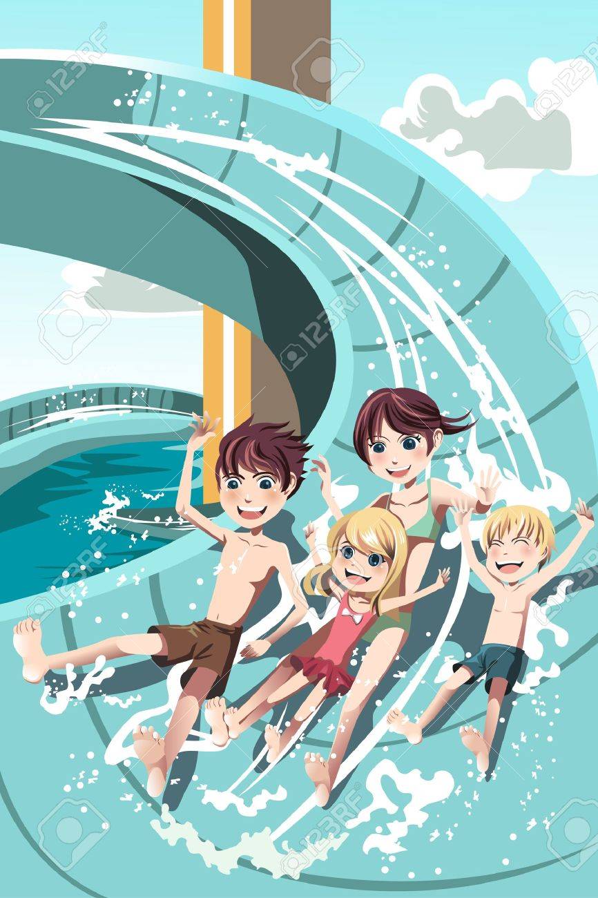 아이들이 워터 파크에서 워터 슬라이드를 재생하는 재미의 벡터 ...