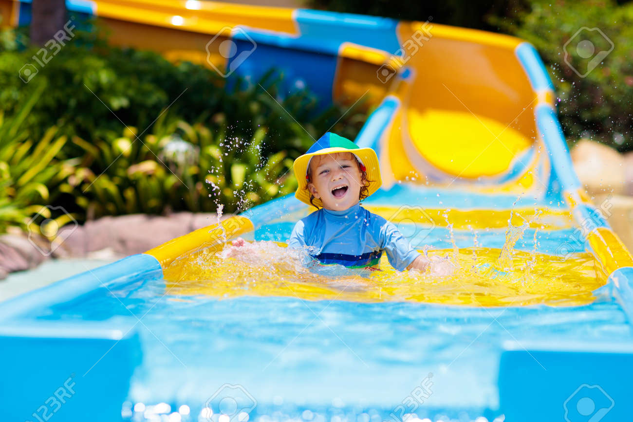 즐거운 소년은 워터 파크의 워터 슬라이드, 워터 파크의 어린이 명소 ...